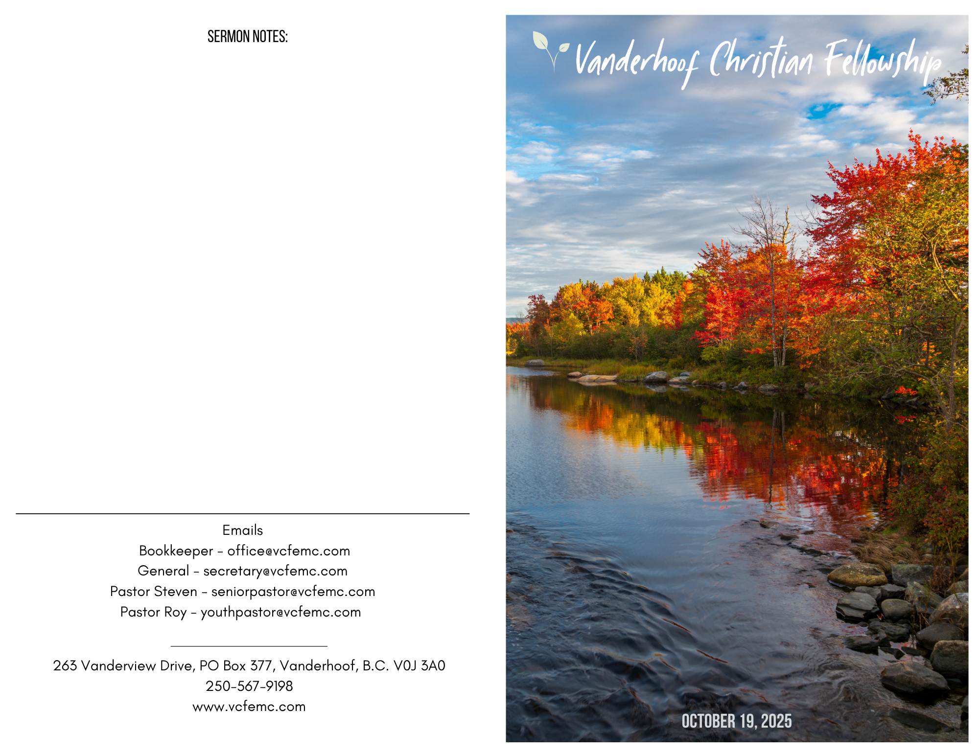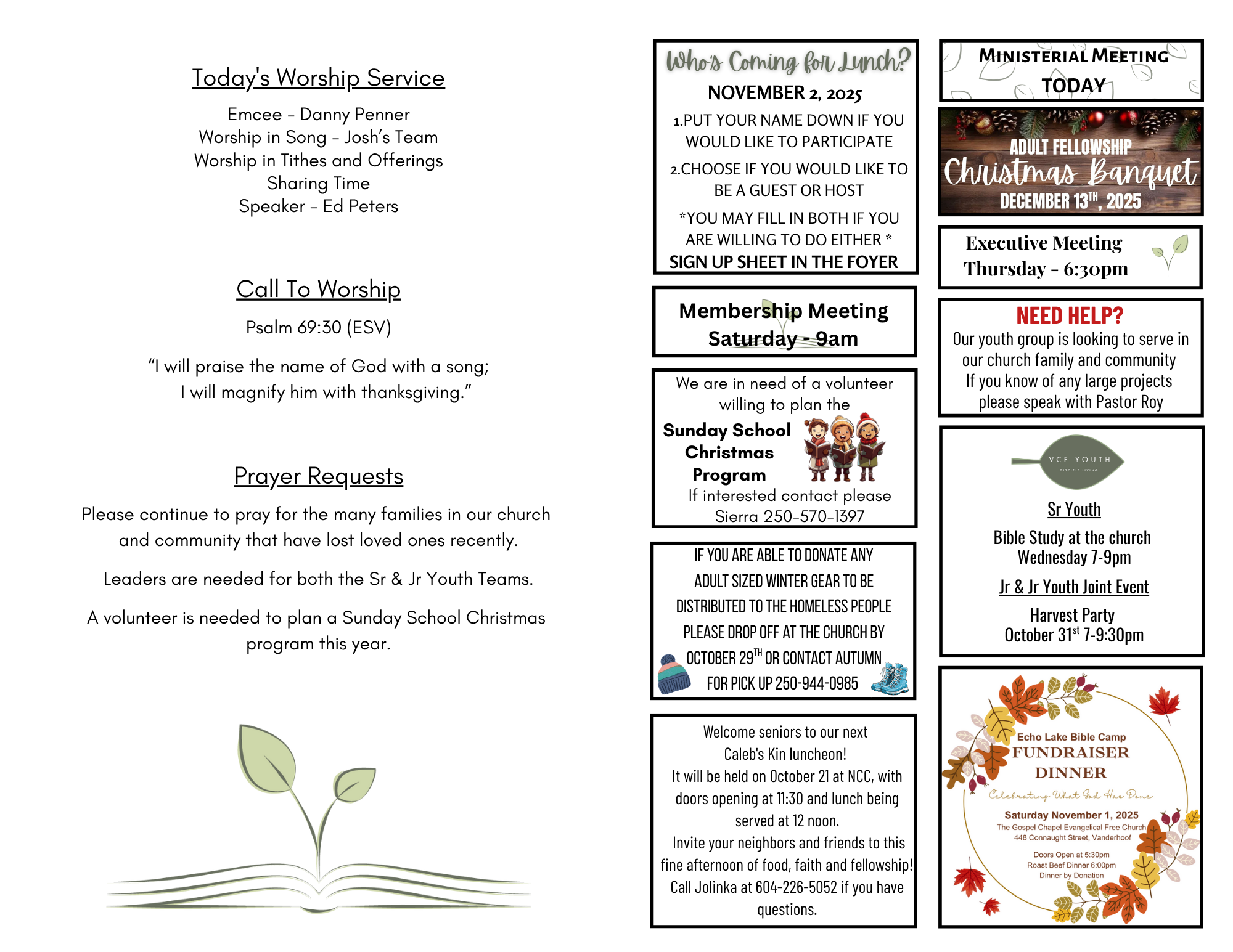 In our weekly bulletin you will find info on current events and upcoming events dates. You will also find any important announcements, who is preaching, and what the title of their sermon is, and the participants of the morning service.